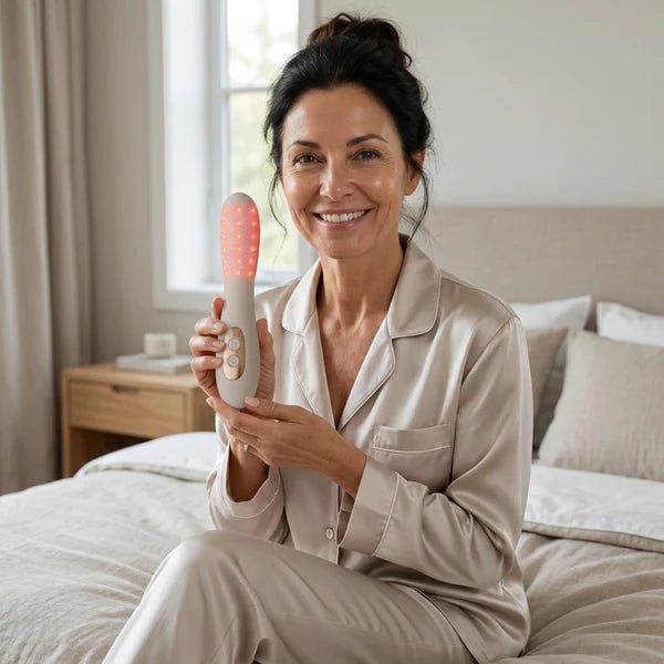Red light therapy (630–850nm wavelengths) penetrates vaginal tissue at the cellular level, stimulating collagen production and boosting blood circulation. This helps restore natural lubrication, reduces dryness and irritation, and rebuilds the tissue that hormone changes, aging, or childbirth can deplete — all without hormones or chemicals.